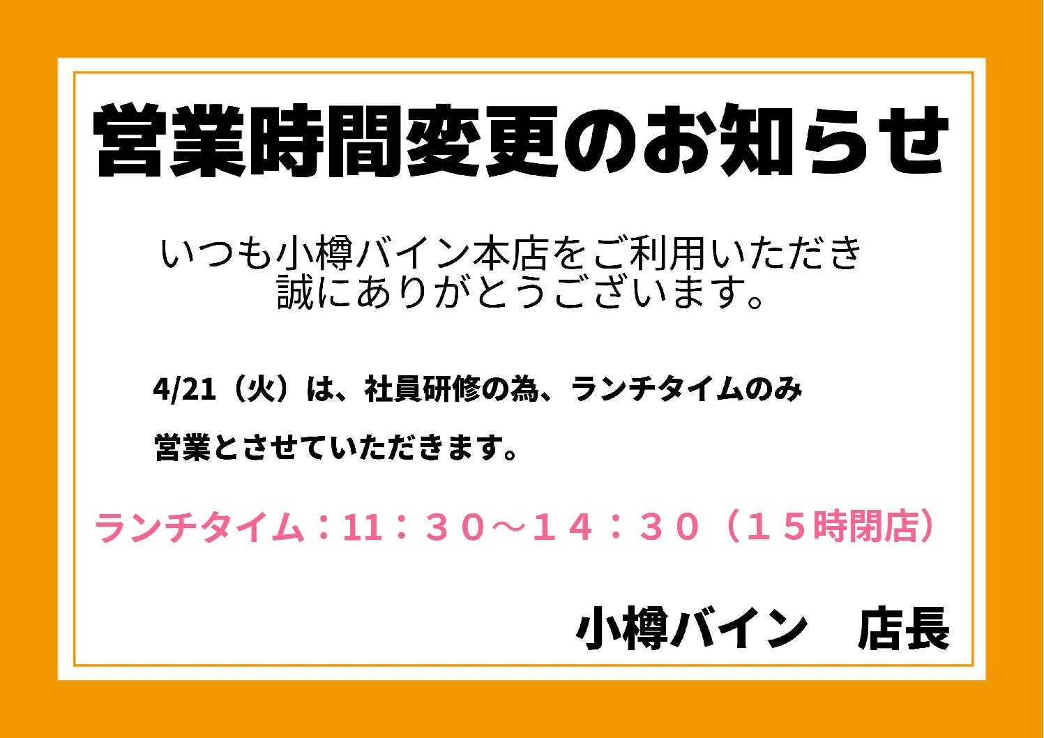 2026年4月21日(火)小樽バイン本店レストラン営業時間変更のお知らせ
