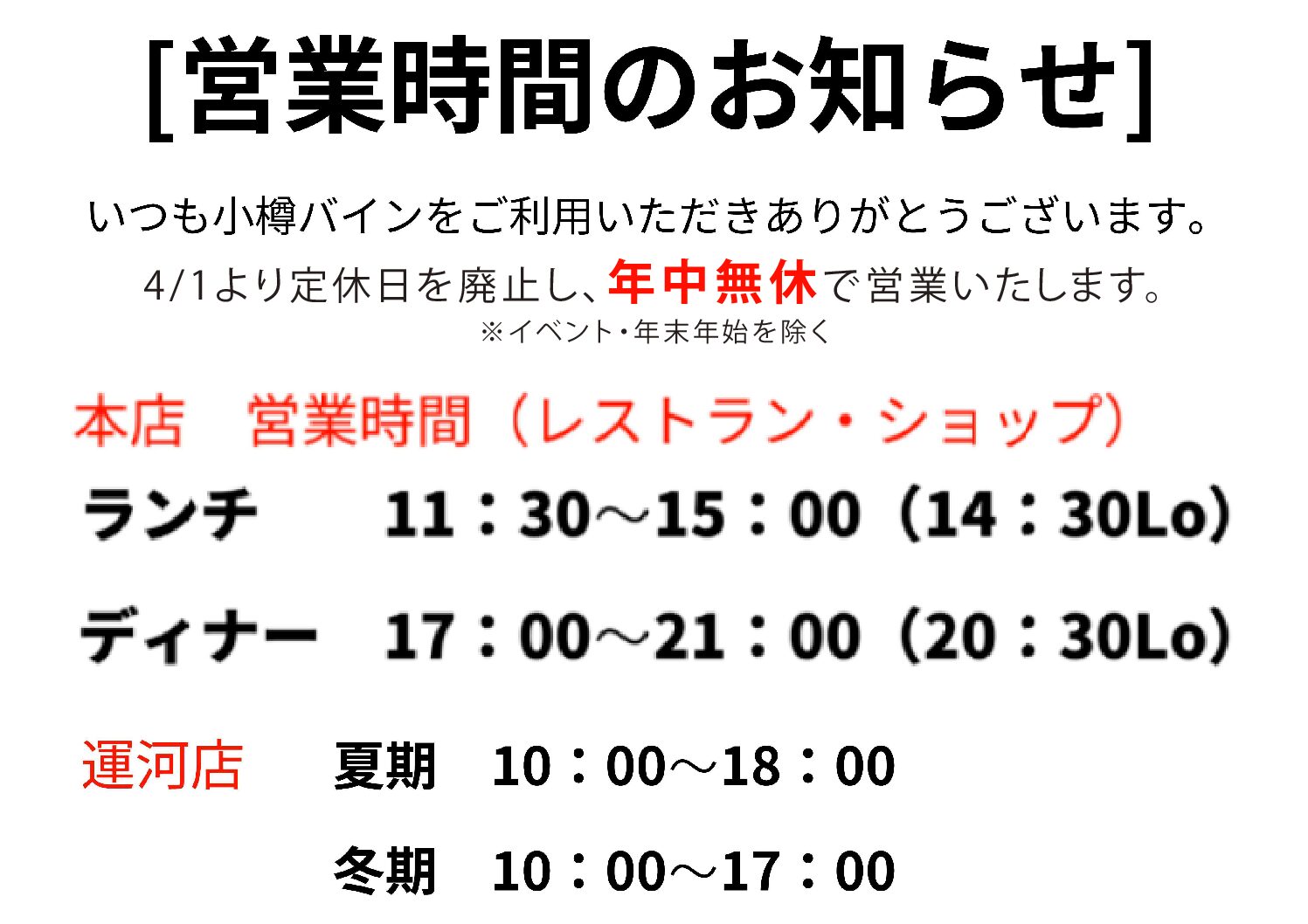 2026年4月1日(水)小樽バイン本店/運河店 定休日廃止のお知らせ
